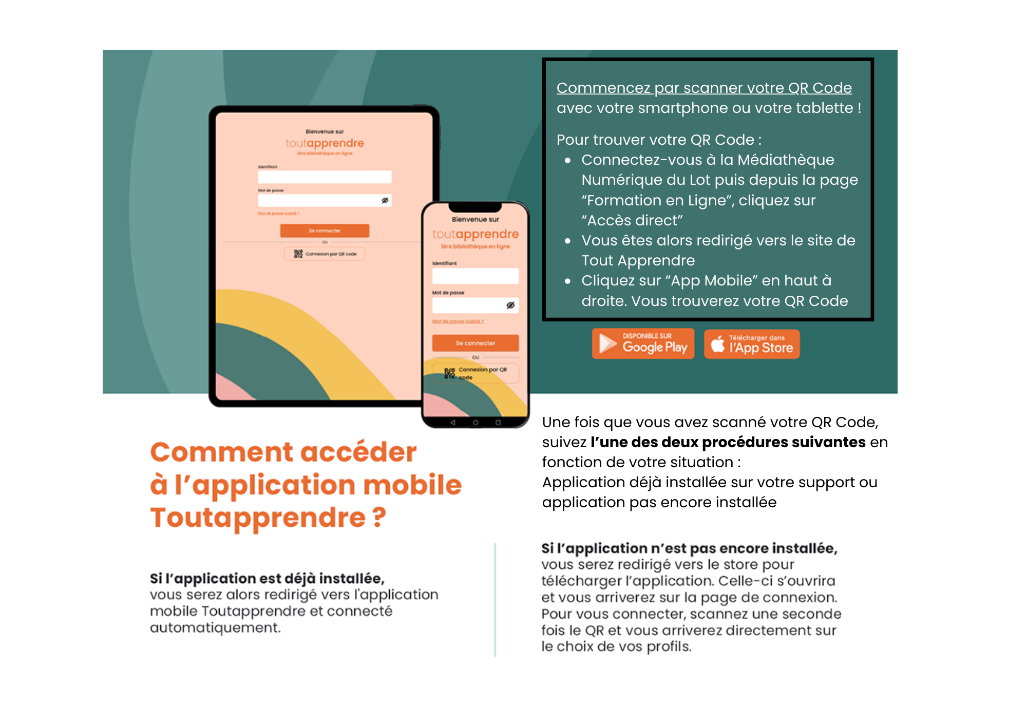 Bon à savoir : Afin de vérifier la validité de votre abonnement à la Médiathèque numérique du Lot, vous serez amené régulièrement à vous reconnecter via le site de la Médiathèque numérique du Lot.